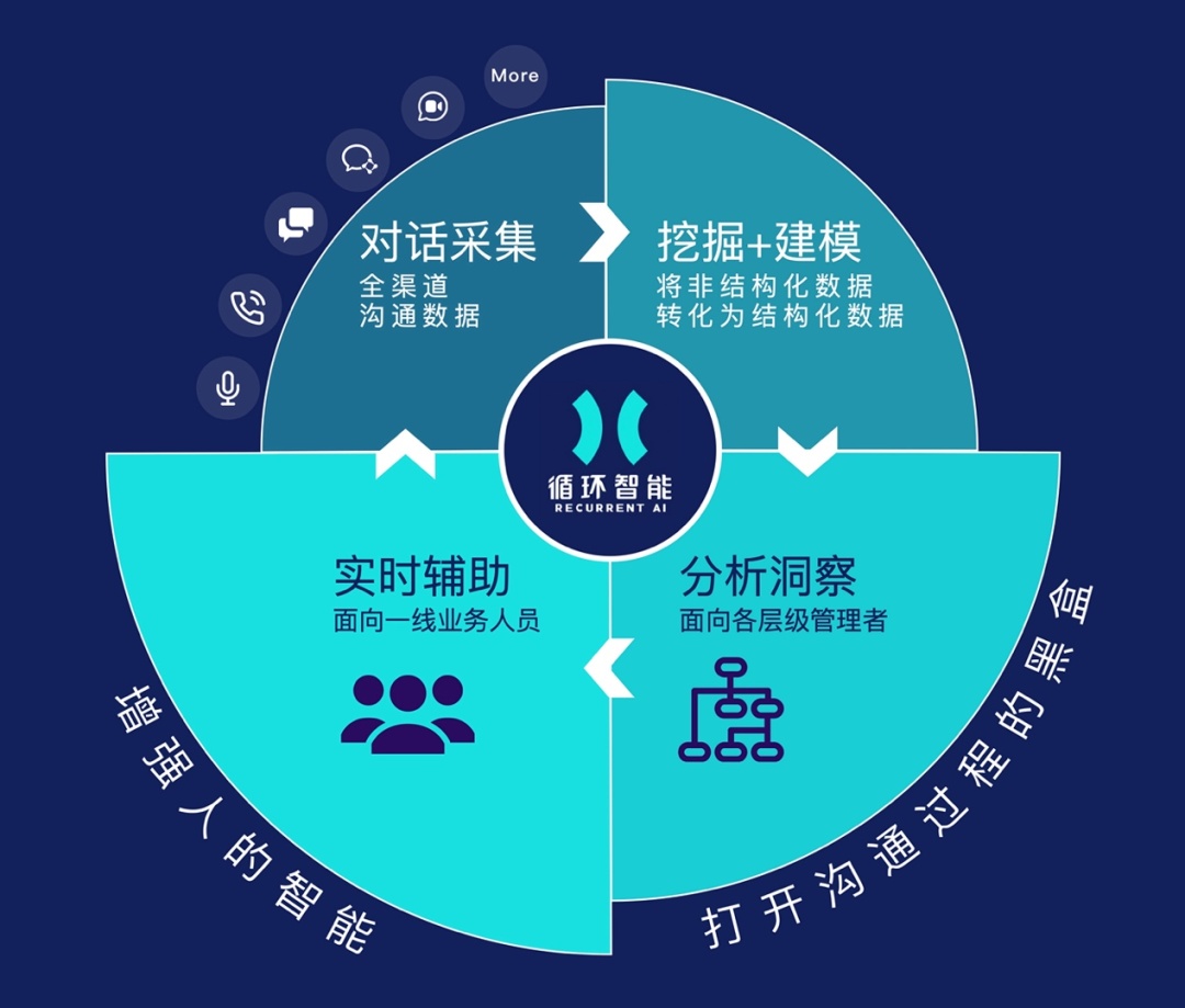 循环智能是一家专注于销售科技领域的企业服务公司,在银行、保险、证券、房地产、汽车等领域能通过AI技术实现线上线下的全渠道沟通场景的数字化赋能。对于保险行业来讲,循环智能借助三大产品矩阵服务客户:帮助企业实现业务增长的智能销售助手+会话分析洞察+会话挖掘引擎、帮助企业实现合规提升的智能合规质检+智慧双录助手、赋能企业打造AI智能化应用能力平台的企业级自然语言处理(NLP)平台+智能物联网平台+自动语音识别(ASR)平台。