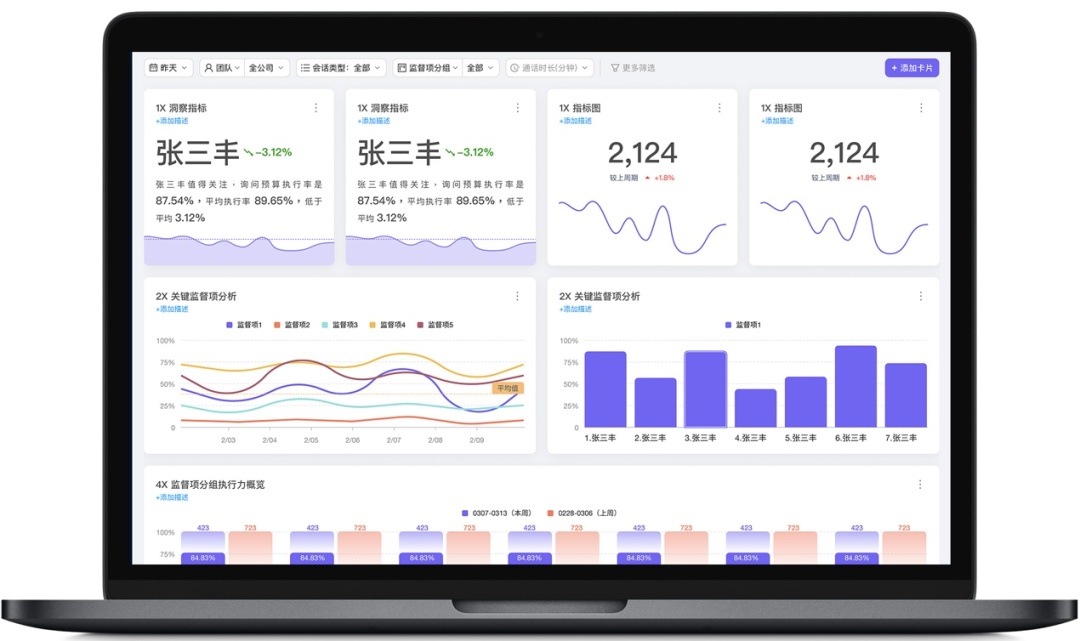 完成对沟通对话数据的挖掘和建模之后,就可以进行全面的数据分析了。循环智能提供了可灵活自定义的全渠道沟通数据分析系统,帮助各层级的管理人员精细化诊断业务问题、洞察一线人员的业务策略执行情况,以及与客户沟通的实际过程,从而不断优化管理流程和营销策略。