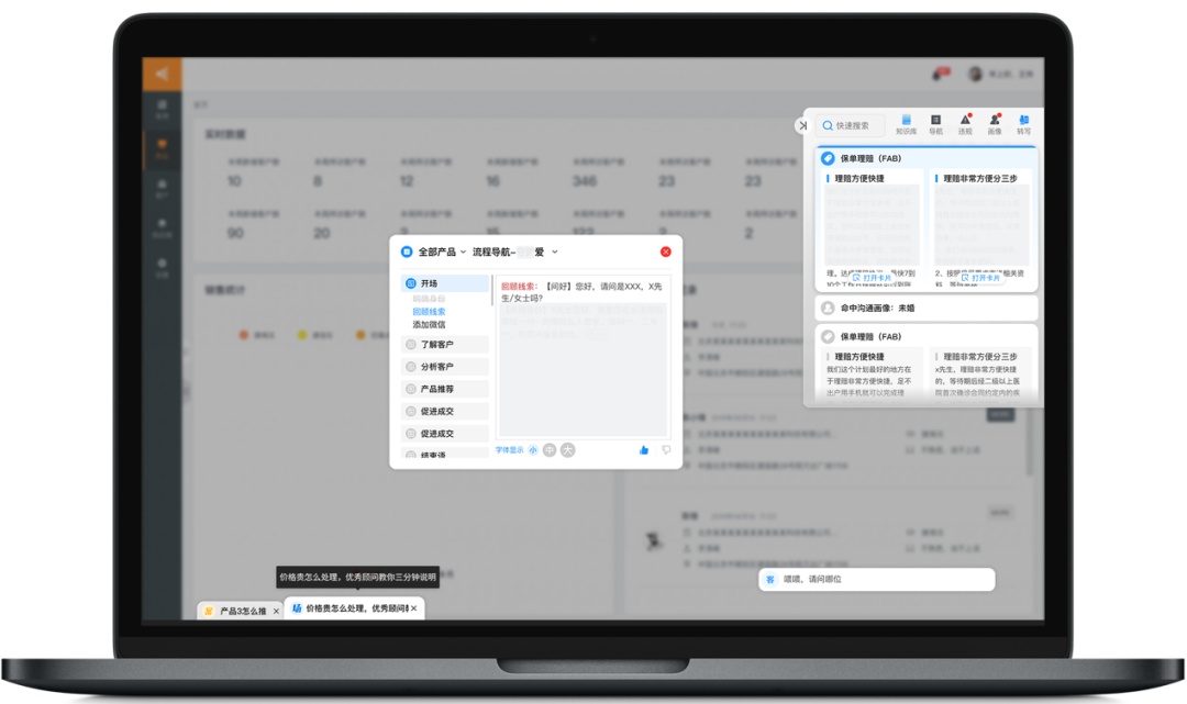 通过前期针对险企真实沟通数据进行业务挖掘及梳理,结合险企已有的业务积累形成一套完整的知识库体系,配置到实时销售助手工具中,在销售与其客戶真实沟通时,根据客戶提出的问题,自动进行优秀话术推荐;当销售人员介绍某一款产品时,通过主动唤醒的方式,呼出对应产品卖点话术、以及根据沟通内容自动判定当前销售流程节点并进行针对性提示、根据对话内容自动命中用戶画像、涉及到销售人员对于过分追求业绩出现一些夸大事实、过度承诺等实时质检违规提醒等功能。